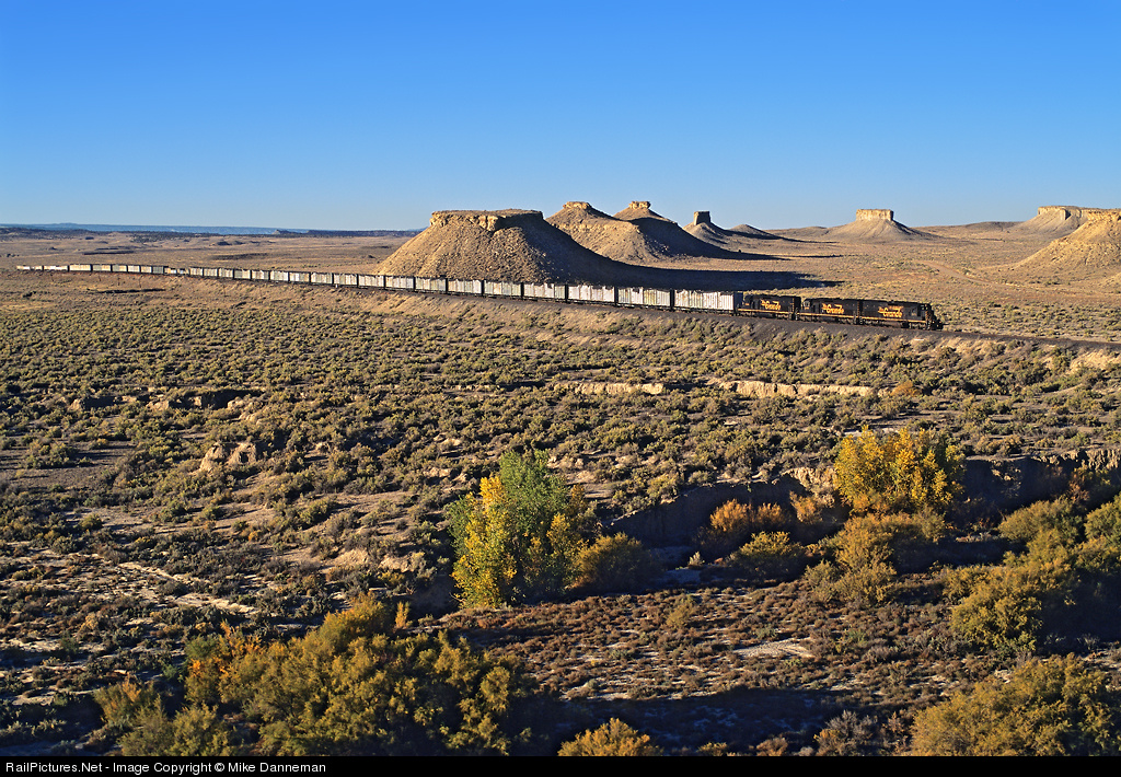 After switching Mounds, Utah, at sunrise, the “dirt train” heads toward East Carbon past low morning light and “John Ford movie-like” desert buttes. Leading the train are three Rio Grande SD40T-2 Tunnel Motors, Nos. 5371, 5349 and 5390. At this point, there were only five D&RGW Tunnel Motors left on the Union Pacific in Rio Grande colors and numbers. So, here is the majority on October 8, 2004. The “dirt train” hauled contaminated dirt, household trash, etc., from Helper (marshaled here from other points like Salt Lake City, etc.) to a landfill at East Carbon on UP’s Sunnyside Branch.