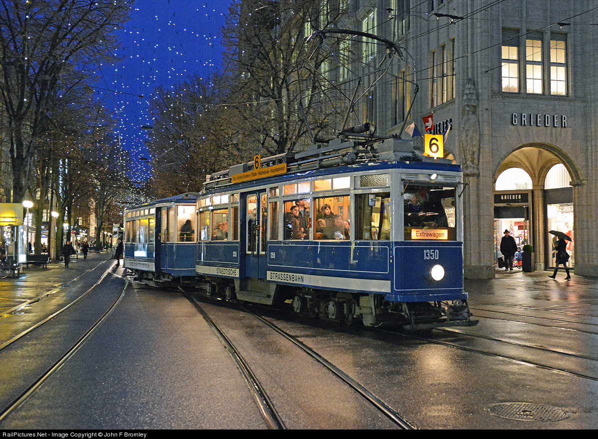 | I can’t recall a trip to Zürich in this century when there hasn’t been at least one of the historic fleet travelling about the system on private charters or purposeful trips such as the Fonduetram. While waiting in a gentle rain for the appearance of the Märlitram, one of the four surviving ‘elefant’ cars came by with an overflow crowd accommodated by a two-axle trailer. As always in the Christmas season, the Bahnhofstraße was beautifully illuminated, this year’s version of the lights gently waving in a light breeze to create a snowfall image. |