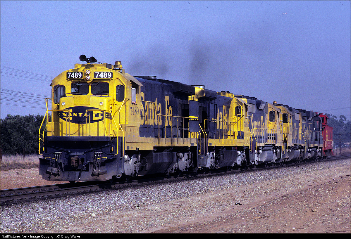 Santa Fe's "Bandini Turn" heads west through Corona, California, on February 7th, 1981. A pair of B36-7 diesels (7489 and 7493) are in the lead, followed by some GPs (GP35s 3448 and 3389, and GP30 3242 - still in the pre-1972 scheme) and CE-2 class caboose 999345.