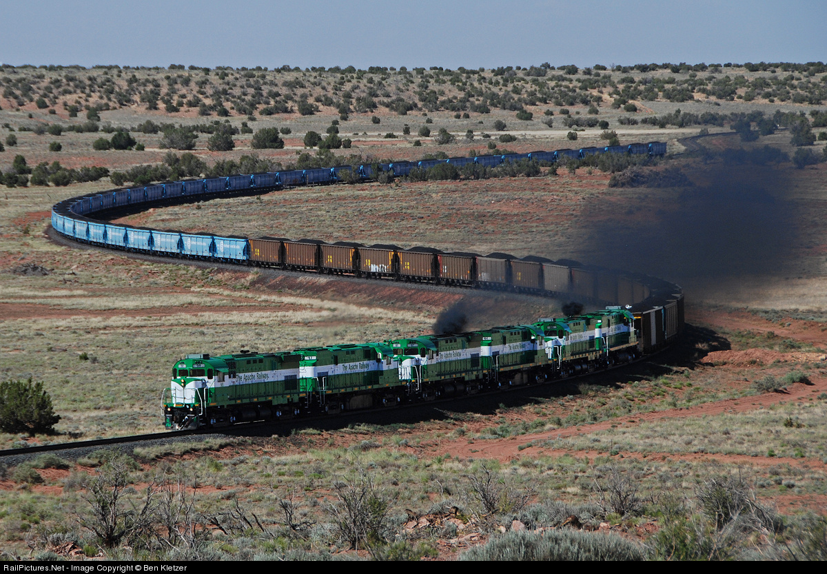 Apache Railway #98 leads the weekly coal train through S curve just outside of Snowflake. Every week the Catalyst Paper Mill, the Apache Railway's owner, required one of these coal trains to maintain paper production. This massive coal train was rated at over 8100 tons and required all 6 of the Apache Railways road locomotives. This was the last great show for ALCo diesels in the Western United States, sadly the coal trains stopped running in August 2012, with the paper mill shutting down the following month.