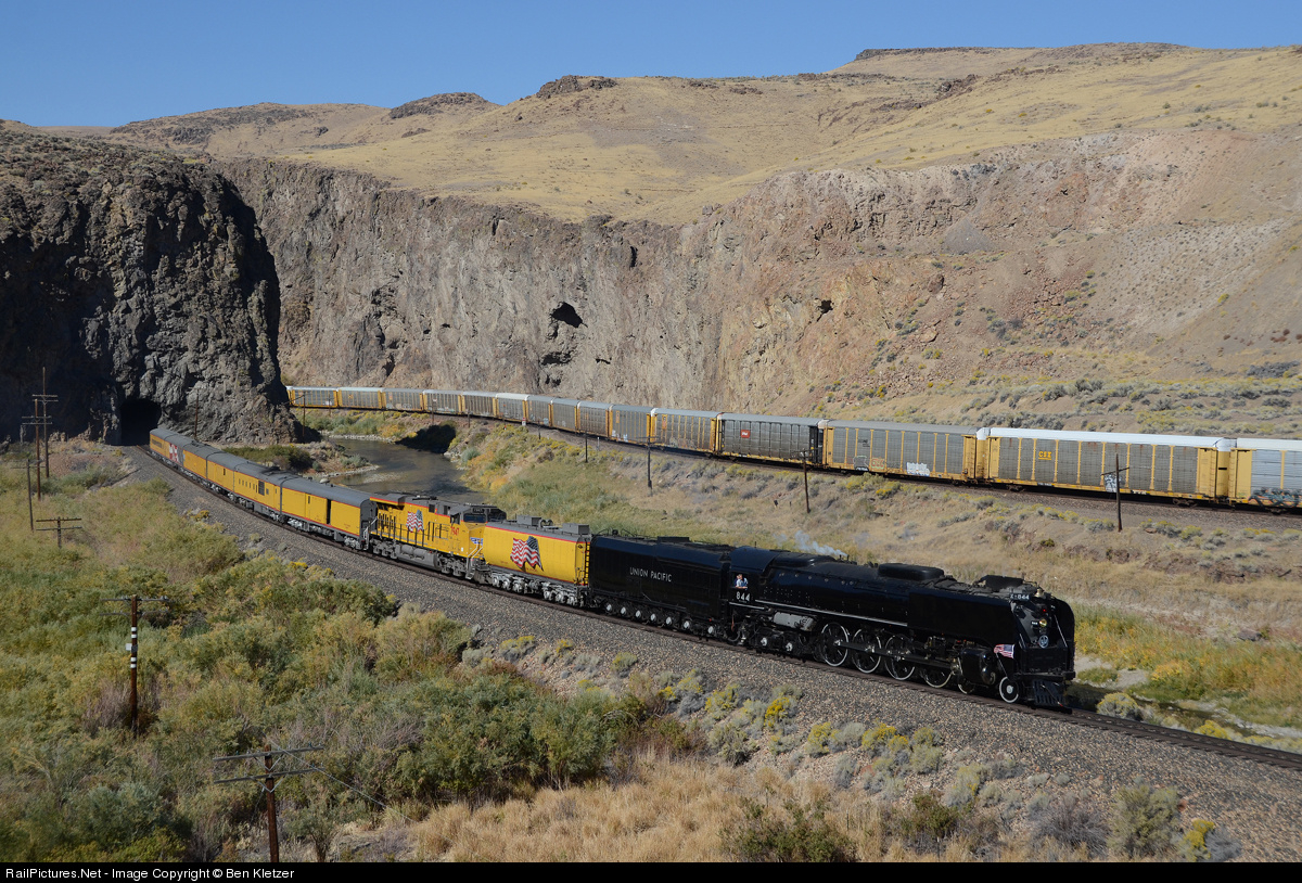 Union Pacific #844 storms through Palisade Canyon on its way east towards its ultimate destination of Cheyenne, WY. This train is running on the former Western Pacific mainline, while the autorack train in the background is on the parallel ex-Southern Pacific main. These twin mainlines parallel each other across most of Nevada, with the scenic highlight being Palisade Canyon. Due to the Paired Track Agreement of 1924, all westbound traffic takes the ex-SP main, while eastbound traffic takes the ex-WP main. For 844, the canyon is familiar territory, as just over a week previously, the train went west on the ex-SP line.