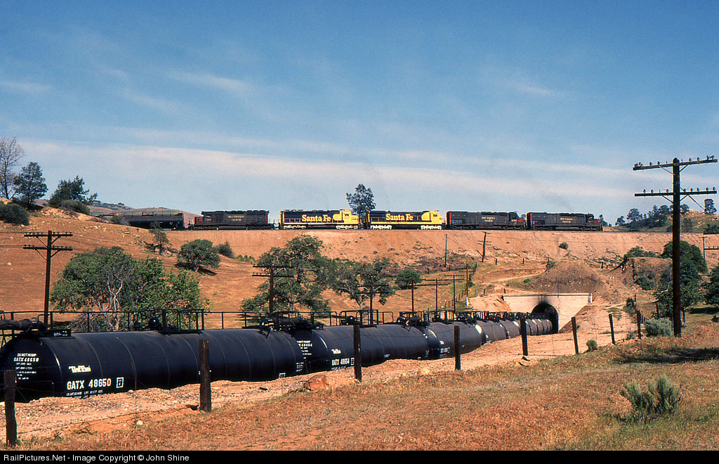 Featuring a mix of Santa Fe and Southern Pacific engines, the Eastbound "Oil Cans" crosses over itself as it traverses the famous "Tehachapi Loop".