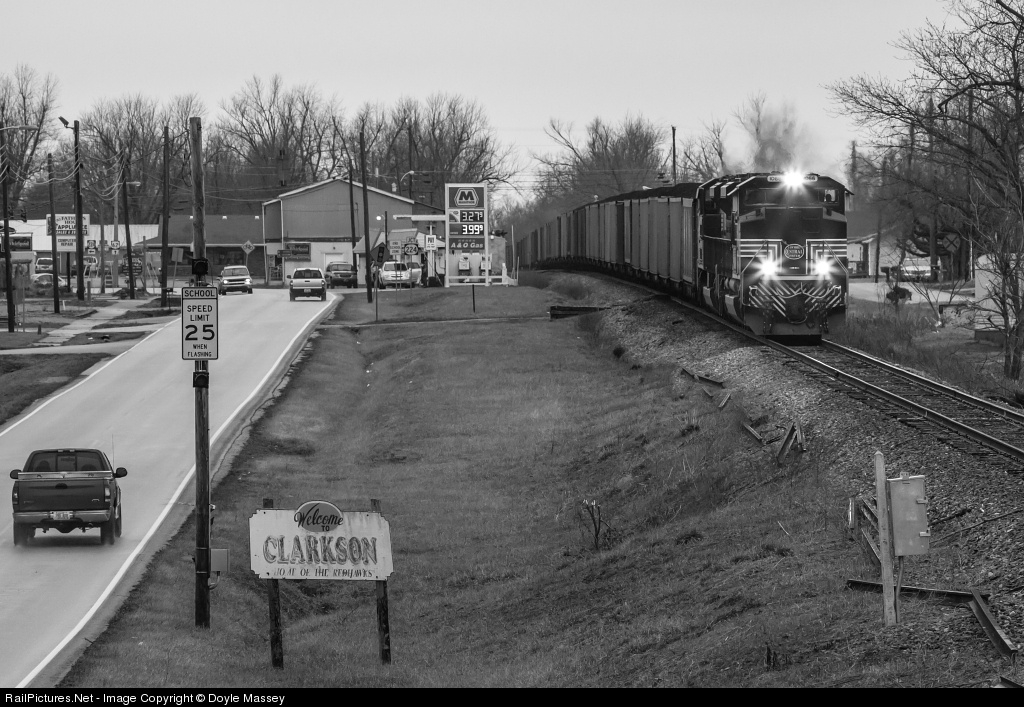 Paducah and Louisville train LSX1 rumbles through the small town of Clarkson, KY with a loaded coal train bound for the TVA Steam Plant at Kingston, TN. The New York Central heritage unit leads the train back to Louisville after loading at Beaver Dam, KY.