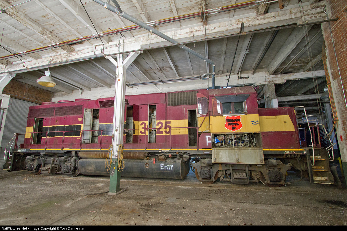 A beat up former Wisconsin Central GP40 3025 sits in a Montana Rail Link shop building in Livingston. Apparently, the GP40 (stenciled RIMX) was acquired by the MRL when CEECO (Coast Engine and Equipment Company) closed in 2009. The GP40 was born Western Pacific. After Union Pacific, it became Chicago, Missouri & Western no. 3025, and later the same number on the WC. The good news is that when time allows, MRL shop forces in Livingston will be getting this beast back on the road.