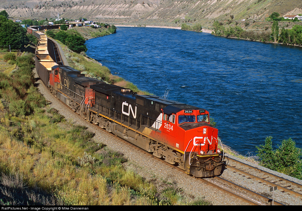 | A westbound Canadian National freight travels along the Thompson River through Ashcroft, British Columbia, on June 24, 2006. |