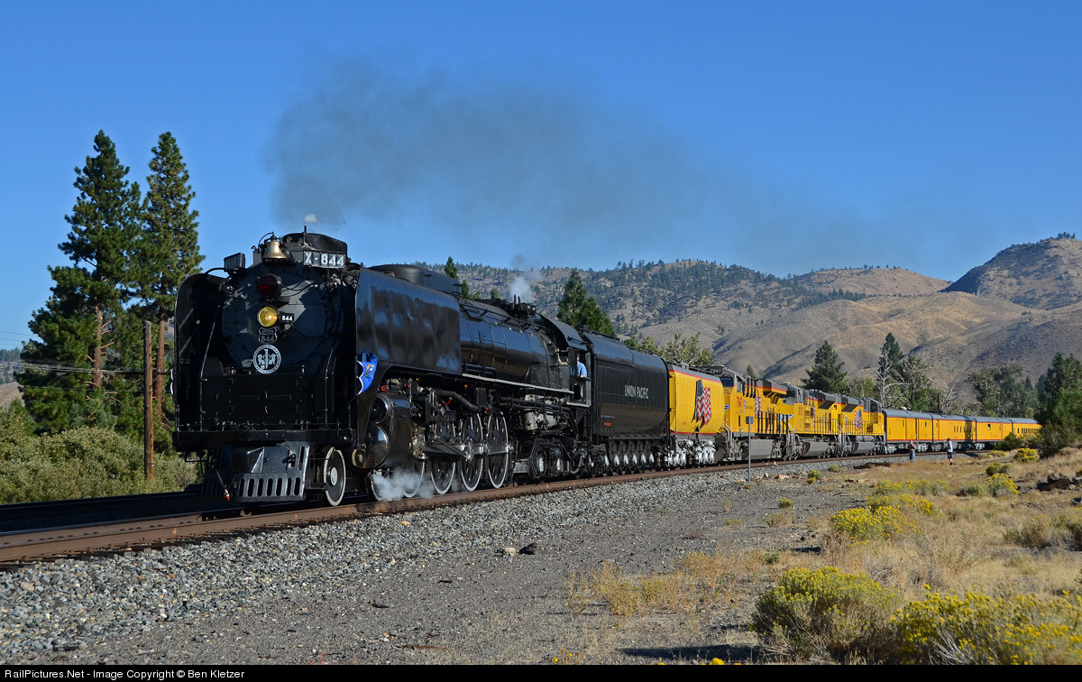 Union Pacific #844 storms up the Truckee River Canyon through Verdi, NV. The locomotive is about to cross the stateline and enter California. By the end of the day, the locomotive and its train will be in Sacramento, CA for the 150th Anniversary celebration at the CSRM.