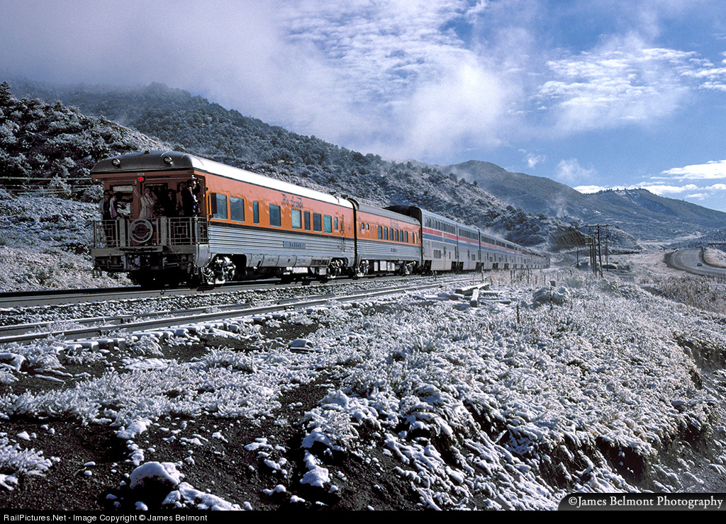 Riders onboard Amtrak's California Zephyr train #6 were treated to a record early snowstorm on Sept. 28, 1986. Rio Grande business cars 'Kansas' and 'Utah' bring up the tail end of the train with riders on the observation platform offering the photographer a friendly wave as the train climbs east toward Soldier Summit.