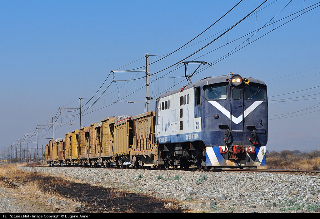 | 160 class 5E Bo-Bo electric locomotives were built for the South African Railways (SAR) between 1955 and 1959. In 2011 the last operational member of the class was part of Impala Platinum's fleet and is seen here on a typical winters day in the South African bushveld, hauling a load of empties from the main processing plant to No.12 shaft. |