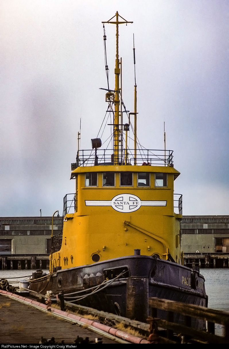 Because the Santa Fe had no direct rail connection to the San Francisco Peninsula, the railroad rostered a fleet of three tugboats to ferry cars on barges across San Francisco Bay. The last of these three, the "Paul P. Hastings," sits at the China Basin car float. This tug was built in 1945 at Point Pleasant, West Virginia, by the Marietta Manufacturing Company, and was acquired by the Santa Fe in February 1948 (and named for a Santa Fe Railroad executive, who was the VP of Traffic when he retired in 1941), and was used until the railroad discontinued service to San Francisco in 1984. After the tug sat unused at China Basin for years, it was sold and eventually ended up seeing service again and renamed "Terminator." On January 27, 1992, following a collision with a cable-laying ship, the "Terminator" sank off Point Arena (about 100 miles north of San Francisco) in water about a mile deep. (San Francisco, California – June 24, 1986)
