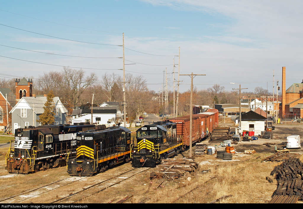 Pioneer Rail GP20 3054 rolls slowly past her newly arrived sister, GP16 1603 and leased NS GP38AC 4148 at Defiance, Ohio on Pioneer's new Napoleon, Defiance and Western