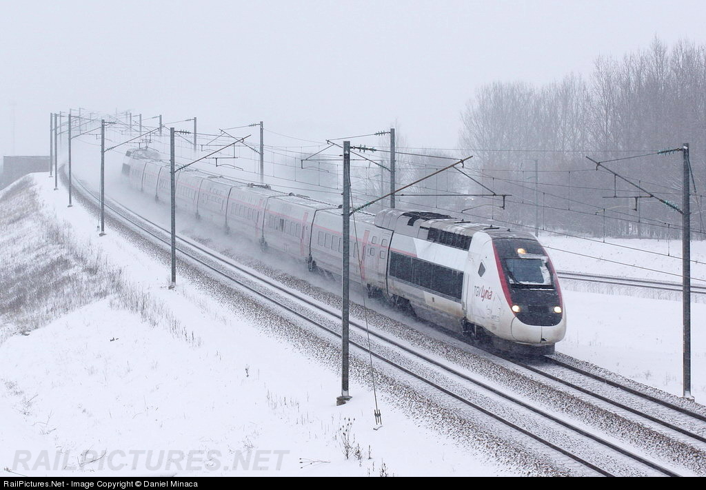 The french high speed train under snow near Paris, rare situation in this location. The high speed trains have speed limit (under 180 Km/h) in case of big snowing.