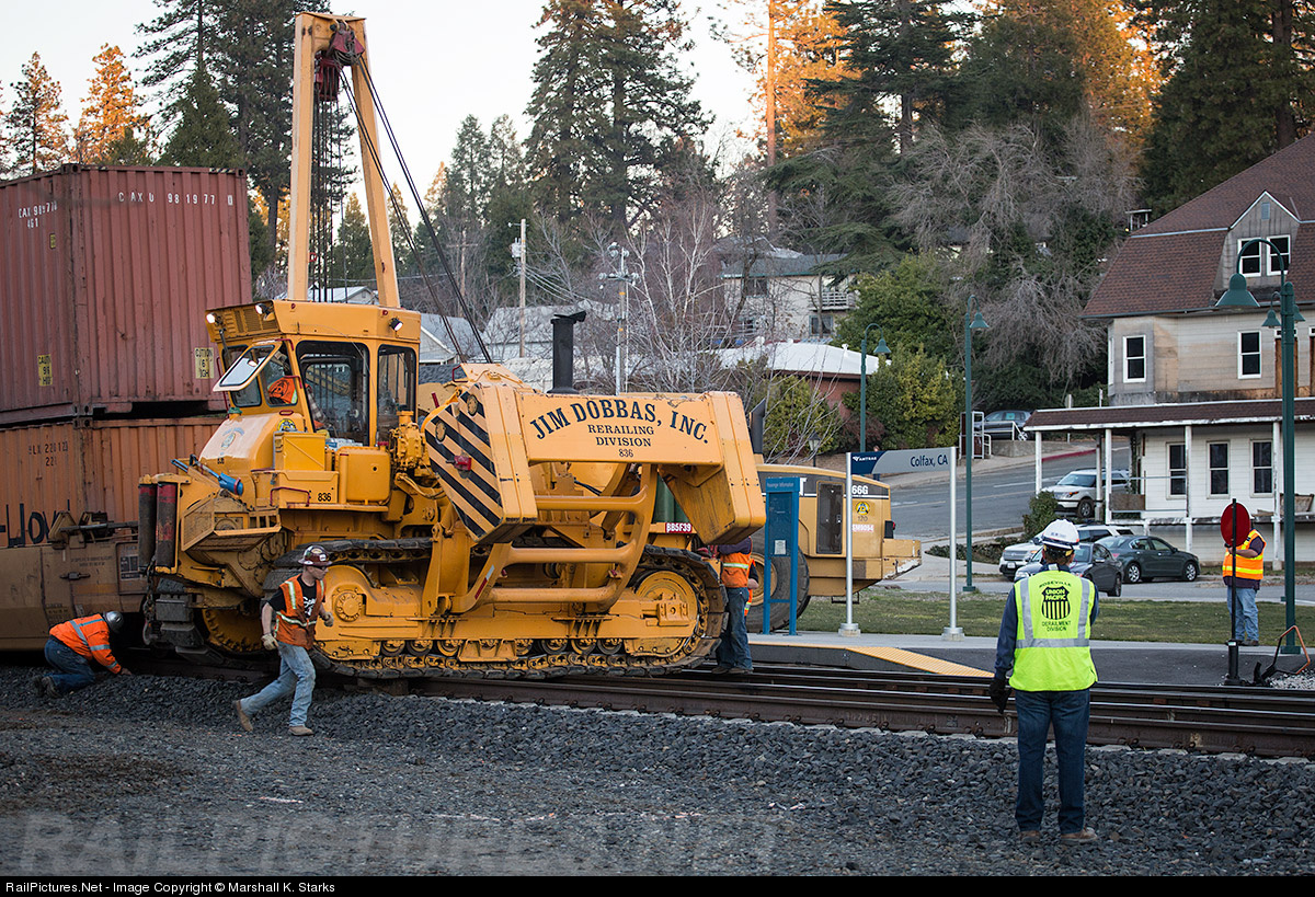 Absolute chaos... A Jim Dobbas employee races to move timber under the tracks of one of Dobbas's massive cranes that is being utilized to clean up the mess from the derailment of the IG3OA in the middle of downtown Colfax.