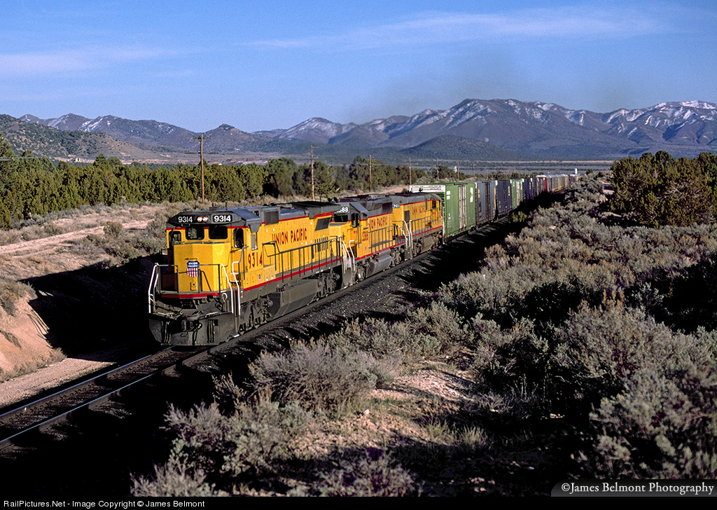 As the shadows grow long on a March 1990 afternoon, the second section of Union Pacific's Los Angeles, CA to North Platte, NE freight glides east along the Lynndyl Subdivision at Tintic. A GE C40-8, an EMD SD40-2, and a GE C30-7 lead this train of of auto parts box cars and auto racks through Utah's remote but scenic Tintic Valley, 80 miles west of Salt Lake City.