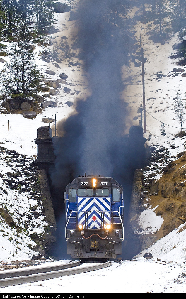 Snow has already fallen at the top of Mullan Pass when a westbound BNSF manifest freight with a pair of Montana Rail Link SD45s as point helpers exited Montana Rail Link's Mullan Tunnel. Before the tunnel was rehabilitated, westbound trains would often send up an impressive plume of smoke as they exited the tunnel.