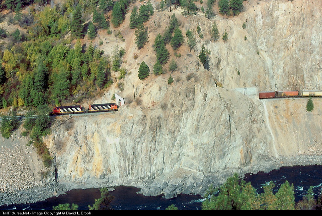 Broken up by a short tunnel, two SD40-2's are westbound in the Thompson River Canyon
