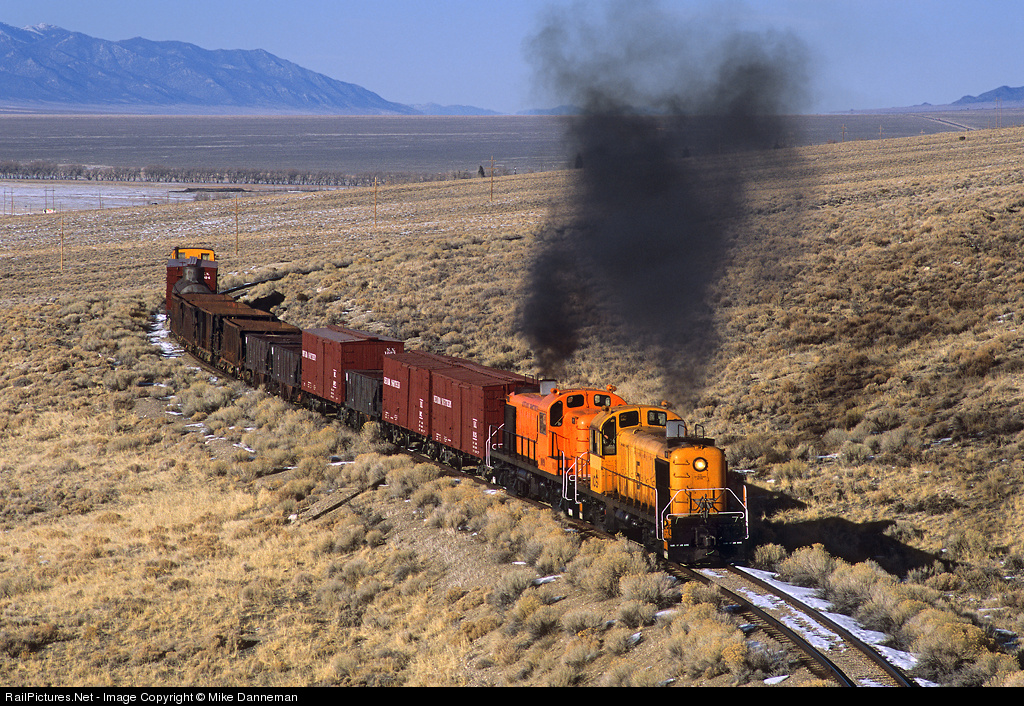 A Nevada Northern freight powered by two smoking Alcos is westbound (southbound) at Adverse, Nevada, on the afternoon of February 2, 2007. NNRY No 105 is a RS2 still in Kennecott yellow, with orange RS-3 No. 109 trailing. Most RS-2s and RS-3s were built to operate long-hood forward, and No. 105 is operating correctly. This freight was operated as a prelude to two days of steam-powered trains during Nevada Northern’s annual “Winter Spectacular” photo trains.