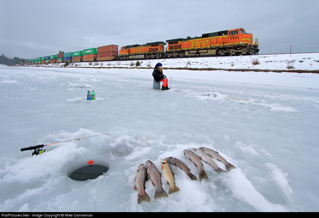 Trout through the ice An eastbound BNSF intermodal train cruises by Frog Pond west of Trout Creek, Montana, on January 25, 2013. Not long before the arrival of this train, the young daughter of one of the ice fisherman trying their luck there, caught her first fish ever through the ice. As two Dash 9s thunder by with a stack train, she patiently waits for another trout to nibble.