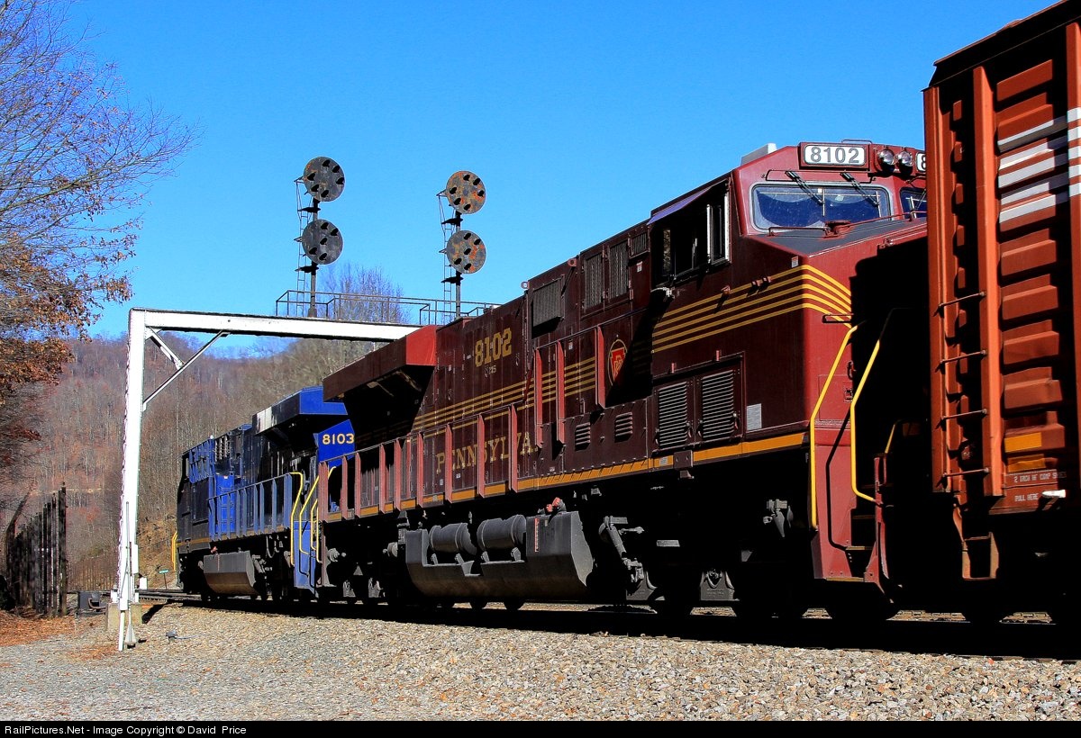 | Consecutively numbered PRR & NW Heritage Units 8102 & 8103 shown earning their keep on the Pokey as pushers, seen here on the "infamous" Elkhorn Grade passing under the old N&W signals. Grade is very apparent here. |