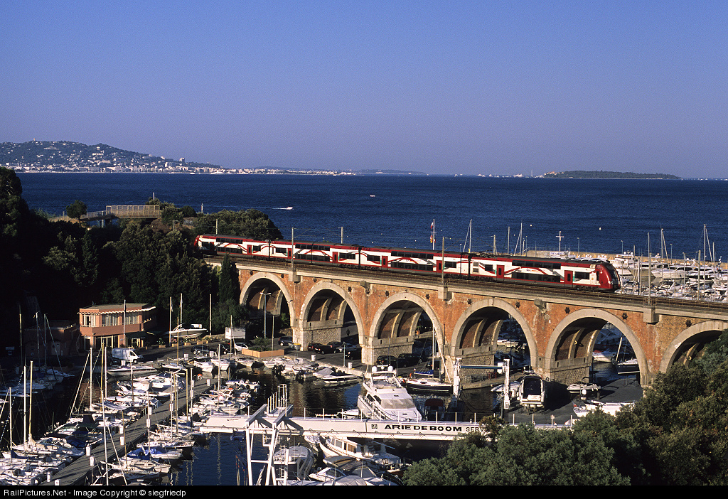 | A TER train in the colors of the Principality of Monaco (french: Principauté de Monaco) from Nice-Ville to Marseille-Saint-Charles pass the marina of Théoule-sur-Mer on the Côte d'Azur. |