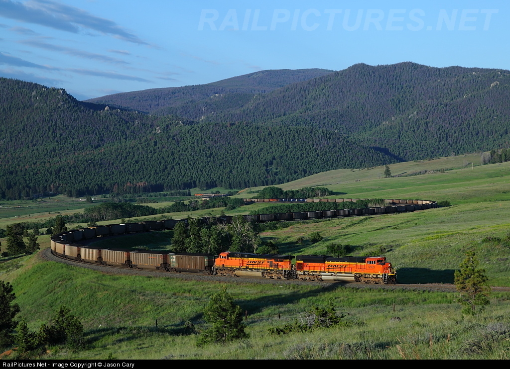 The sun has just cleared the mountains as SD70ACE BNSF9161 lifts an export coal load towards Mullan Pass, MT. The multiple 10 degree curves at the Austin "loops" add resistance to the heavy unit train as it combats the compensated 2.2% grade. This is the toughest part of the climb for the Continental Divide on the ex NP mainline. This coal load is using 8 of the most powerful locomotives in existence to muscle this train westward. Can you imagine the scene with multiple NP articulateds?