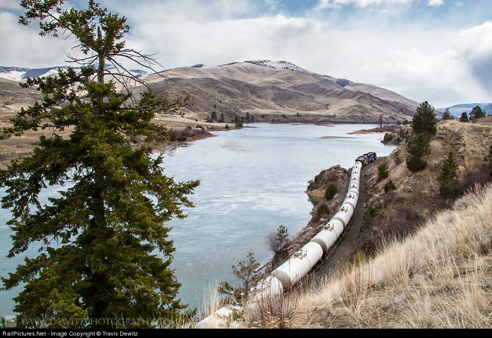 | The white tank cars of the gas local caress the bank of the Flathead River on there way east from Thompson Falls to Missoula, Montana. The gas local is the missing link between the two pipelines. The section between the terminals was taken out of operation due to the many problems it had in years past. |