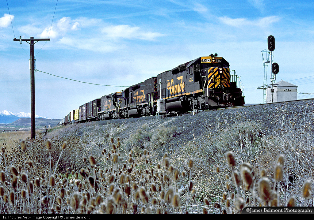 Rio Grande dispatcher #5 has lined mixed freight #148 out of the Mesa siding onto the mainline a minute or two after the passage of hot intermodal train #101. Time has altered this landscape in the past quarter century to include a commuter rail station, hundreds of new homes, a 200 acre golf course and 740,000 acre business park.