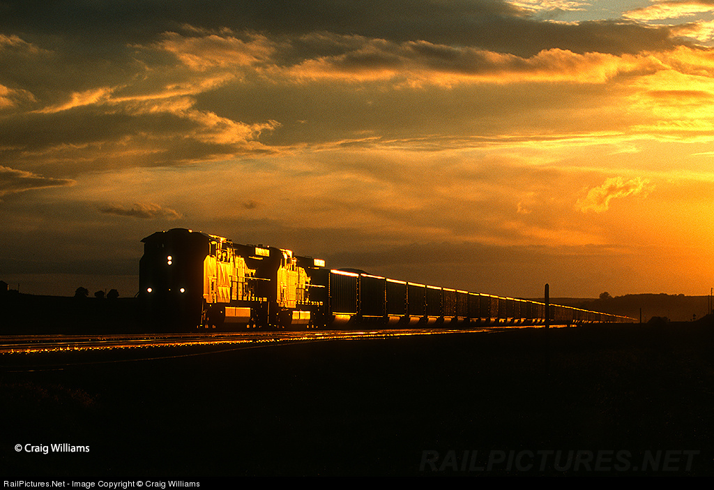 The last rays of sunshine light up this eastbound coal train near Westside in western Iowa. This train is working upgrade towards to Iowa Divide at Arcadia.