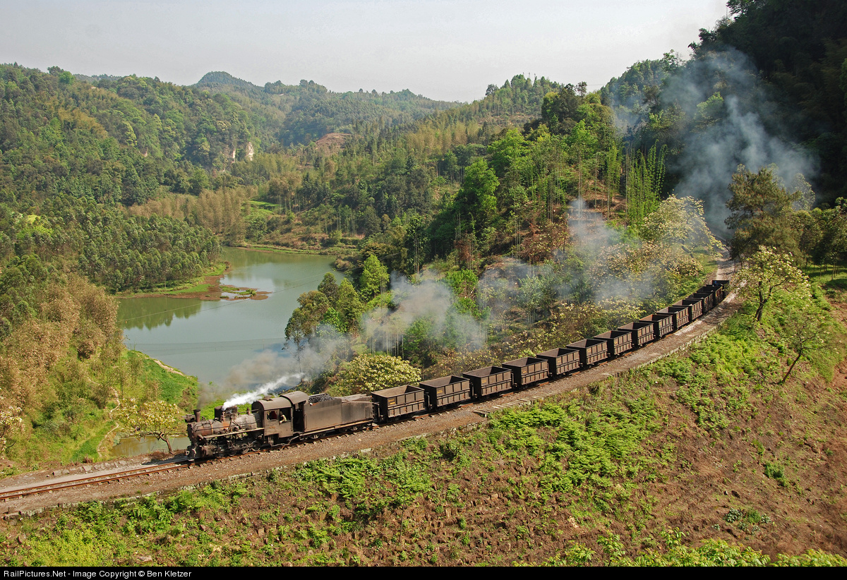 The second morning coal train coasts downhill through one of the scenic highlights of the Ba-Shi Railway. This location, known as Liangsuituo to locals, is where the 760mm gauge railway emerges from a narrow canyon, and crosses a small lake on a large fill. This coal train is bound for the small coal mine at Huangcunjin, the end of the railway, where it will be manually loaded. Like the passenger trains of the Ba-Shi Railway, all coal traffic on this section was 100% steam hauled, using link-n-pin couplers, and handbrakes. The loaded coal trains were kept in control on the steep 3.9% grades by two brakemen, who would crawl along the side of the train to apply and realease all the brakes as required.