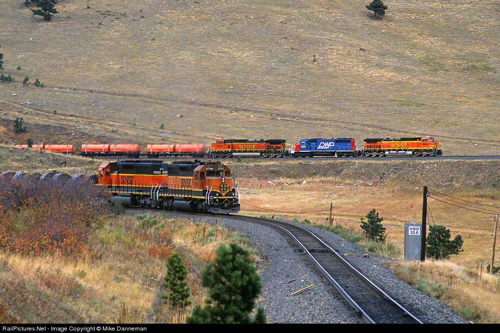 A westbound Burlington Northern Santa Fe steel coil train grinds up the 2% grade at the mouth of Coal Creek Canyon west of Clay, Colorado, on October 17, 2001. On the point of the short-but-heavy train is a pair of BNSF Dash 9s sandwiching a very out of place Duluth, Winnipeg and Pacific SD40 No. 5905, and pushing hard on the rear is a manned set of SD40-2 pushers. The action takes place on Union Pacific’s Moffat Tunnel Subdivision west of Denver.