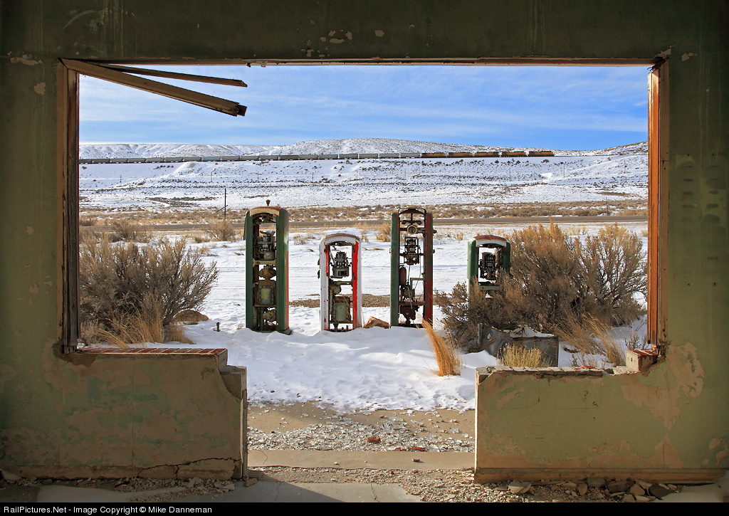 As seen from inside a long-abandoned gas station along the old Lincoln Highway (later, U.S. Highway 30) at James Town (west of Green River), Wyoming, a Union Pacific unit soda ash train ascends Peru Hill on the morning of January 20, 2013. I have photographed this scene before, but thought that the addition of snow gave the place a new dimension, further defining the train and the skeletons of the old gas pumps out front with the light blues and white of winter. Five big GEs power the train, along with a sixth unit placed mid-train as a DPU.