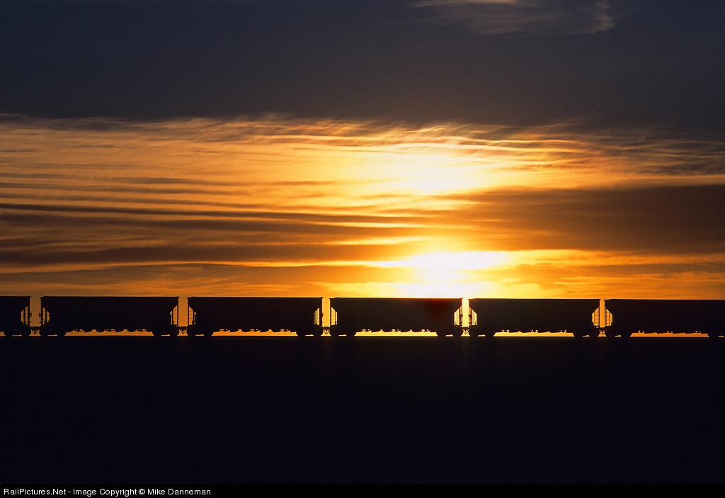 Stratified sunset: During a vivid Wyoming sunset on May 29, 2009, a set of coal hoppers on a BNSF train rolls back to the mine for another load of black diamonds from Powder River Basin just south of Bill. Thin, stratified clouds effectively divide the power of the sun that spreads across the seemingly endless prairie.