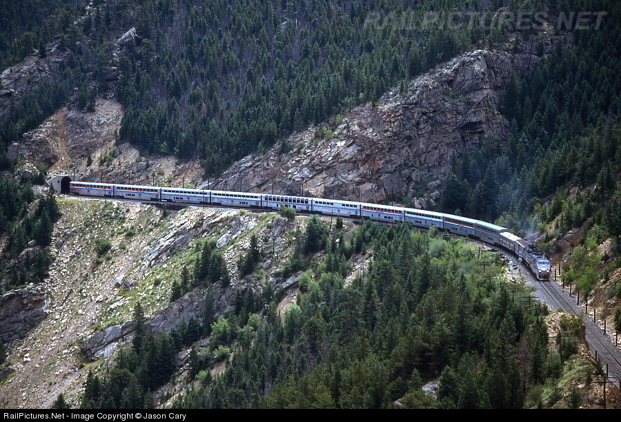 Amtrak exits tunnel 26 deep inside South Boulder canyon. This was the site of a horrible wreck that occurred in 1991 that took the lives of two crewman. A memorial is at the tunnel. The plaque can be seen in this photo.