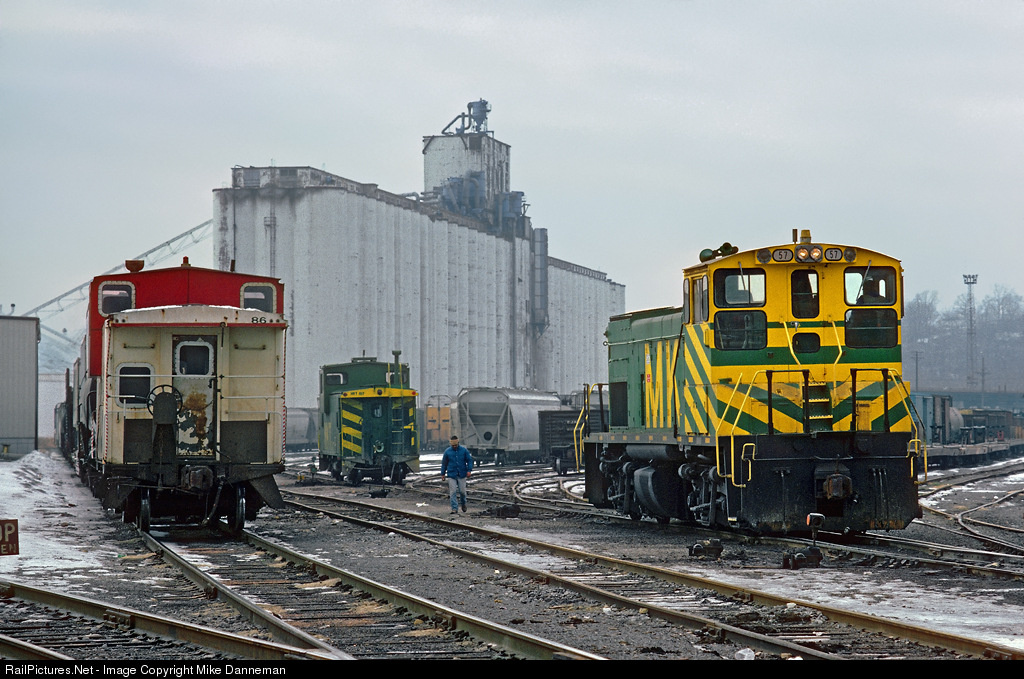 | On a damp December 8, 1985, MKT MP15AC No. 57 switches at Glen Park Yard in Kansas City, Kansas, as cabooses from the home road and Soo Line stand by. |