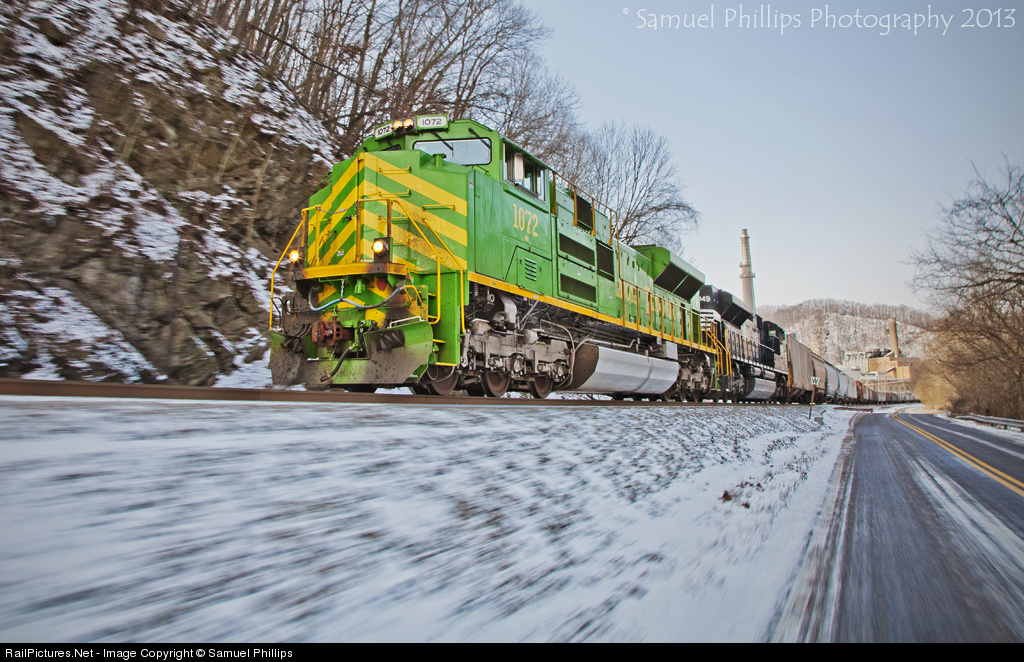 On a frigid morning, the engineer on eastbound manifest No. 188, begins notching out the throttle as it clears a 10 MPH slow order(in effect due to a bridge replacement project) within the quaint hamlet of Glen Lyn, Va.. The bright popping colors hosted on NS' Illinois Terminal heritage motor, completes the scene as it treks across the former Norfolk & Western to Roanoke.