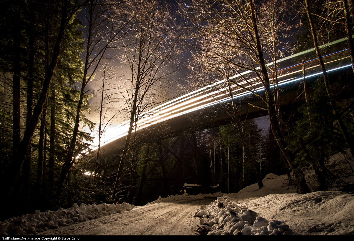 East of Skykomish, Wa. BNSF's Scenic subdivision uses the canyon of Foss River to gain elevation for its climb to Stevens Pass. At the head of this horseshoe lies the Foss River trestle. In this photograph an east bound stack train's headlight illuminates the area around the trestle highlighting everything around. In just a few brief moments the train's passage will be complete and quiet will return to the Cascades.