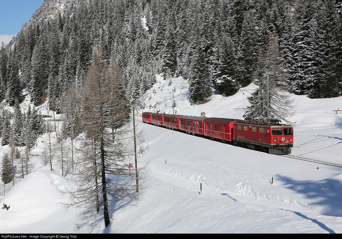 | 60 years old Ge 4/4 I # 605 "Silvretta" is pulling the sledgers train from Bergün to Preda. The sledgers will glide down the run in the foreground (in summer the Albula Pass road) in a few minutes to Bergün. |