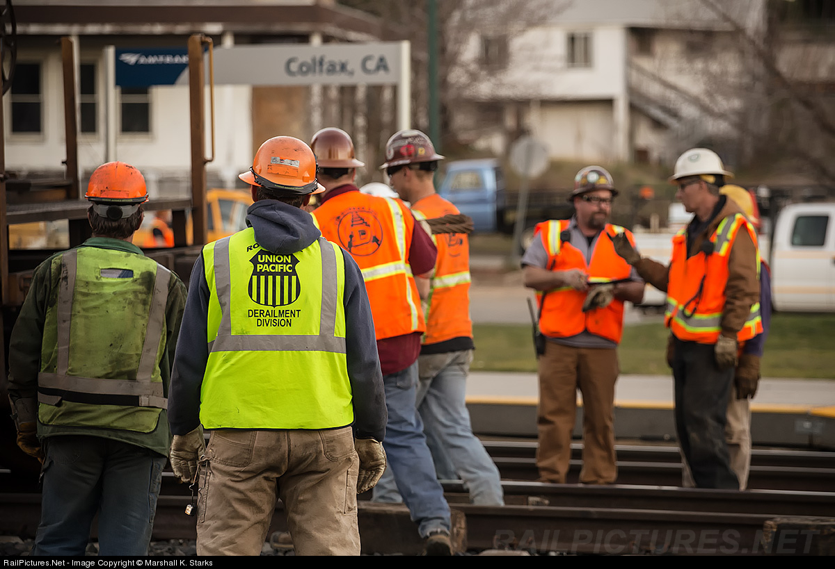 | Crews from Jim Dobbas and Union Pacific's Roseville Derailment Division are on site at the derailment of the IG3OA at Colfax, Ca. |