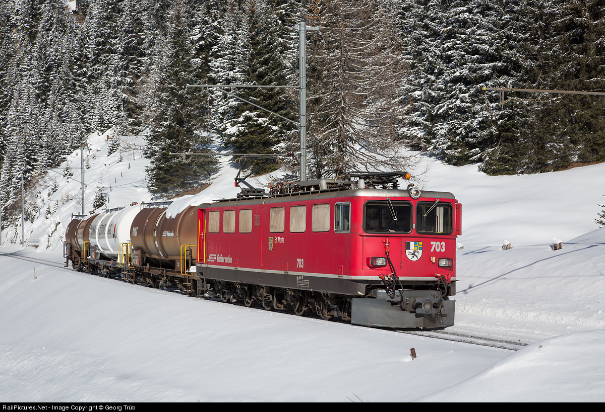 | Ge 6/6 II # 703 "St.Moritz" with freight train 5135 from Landquart to Pontresina below Preda. The second tank car (Za 8141, for fuel oil) has a new publicity paint for Conrad-Storz AG in Samedan. |