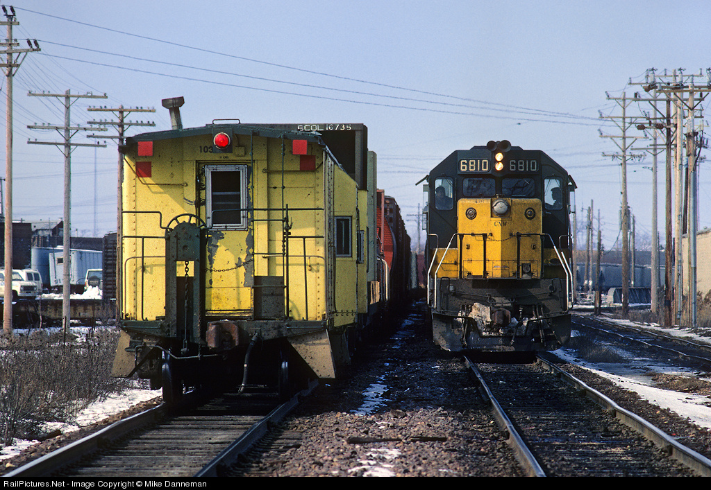 Meet at Butler Chicago and North Western SD40-2 No. 6810 has a new crew and is ready to leave Butler Yard, Wisconsin, on March 2, 1986. A westbound train sits on the other main with two cabooses on the rear. I shot a lot around Butler over the years and the thing I remember about photographing trains at the south end of the yard was all of the poles and wires running amuck; think they could add anymore?