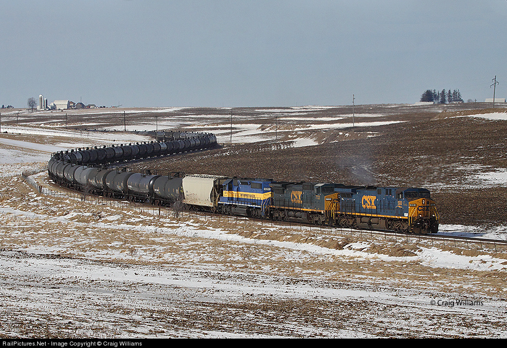 | A loaded train out of Hartley, IA, drops down the grade into the Mississippi River Valley. Here the train is 11 miles west of Marquette as it snakes its way the last 11 miles. At Marquette the rear motor will be dropped off, and the 2 CSXT will make the trip the rest of the way to Chicago. Photo taken on private property with permission. |