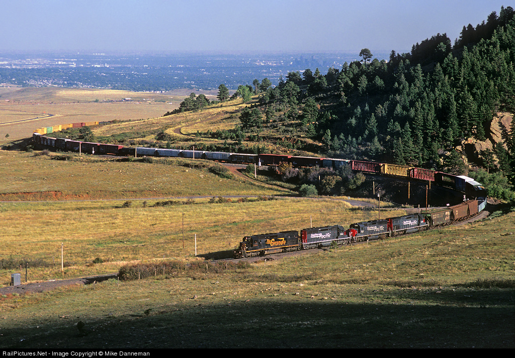 Union Pacific’s MDVRO freight between Denver’s North Yard and Salt Lake City’s Roper Yard passes over Blue Mountain Drive west of Clay, Colorado, on September 23, 1999. Four EMD’s from the two predecessors of this scenic route power the train. Rio Grande SD40T-2 No. 5384 leads three speed-lettered Southern Pacific locomotives; SD40M-2 No. 8641, GP40R No. 7965 and SD40T-2 No. 8496.