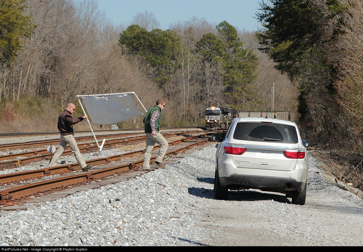 STOP-Obstruction Ahead That's what the sign the NS supervisors are carrying away said. To test the crew of the southbound TVA coal train to see if they followed the speed restriction, the supervisors placed the sign on their track. If the crew could stop their train within 50 carlengths of seeing the sign, which they did (they are stopped in the photo) then they passed. Here, the supervisors are carrying away the sign before a rolling meet between the coal train and a northbound autorack.