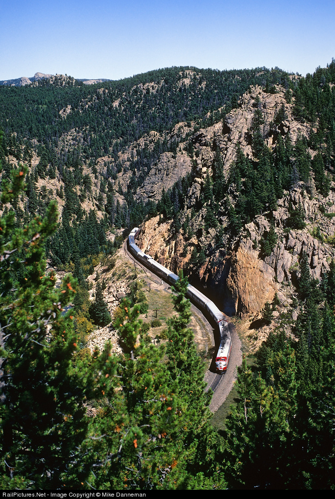 A chartered Wisconsin and Southern passenger train operated through several western states in September 1998—the so-called “Bill Gates Special”—was westbound at the site of former Tunnel 28 east of Pineliffe, Colorado. It was a rare opportunity to observe EMD E units working on steep grades, since most western railroads shied away from the A1A-trucked E unit in favor of EMD’s F unit for passenger trains on mountain grades.
