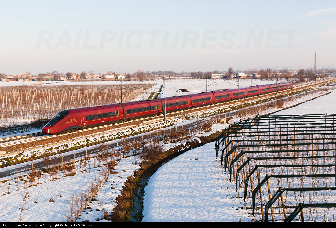 NTV – Nuovo Trasporto Viaggiatori High Speed Train 575 called Italo, increasing up its speed until reach 300 km/h in the Bologna Milano high speed line , here passing in the Castelfranco Emila´s snowy fields. This ETR 575 series, was built by the French Manufacturer Alstom, and it is the first high speed train on the fourth generation Of high speed trains family in France.