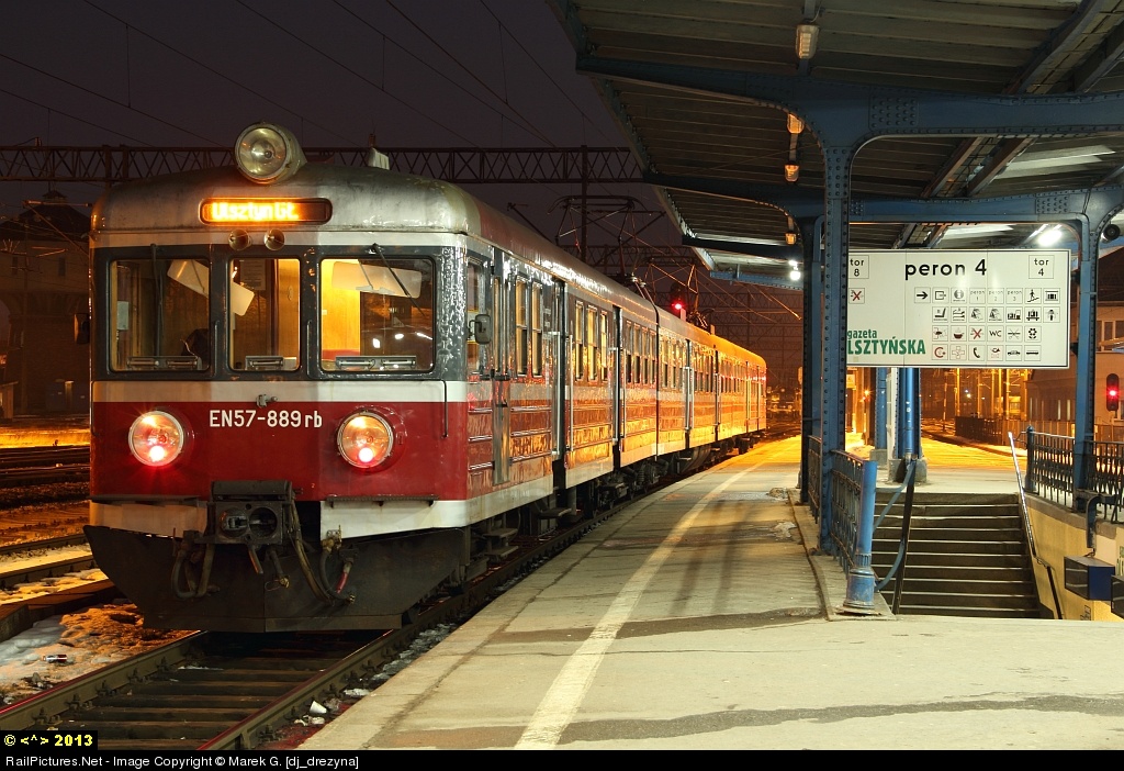 The Electric Unit EN57 Series ended its trip from Elbląg Station to Olsztyn Główny Station and is on platform 4 waiting for the white signal on semaphore to go to the shed.