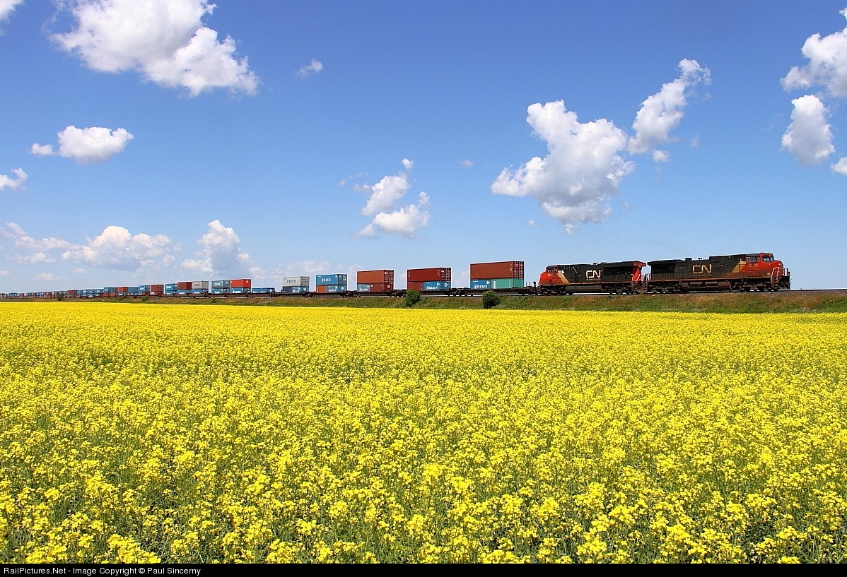 CN's Q198 rolls through a canola field on the east side of Portage.