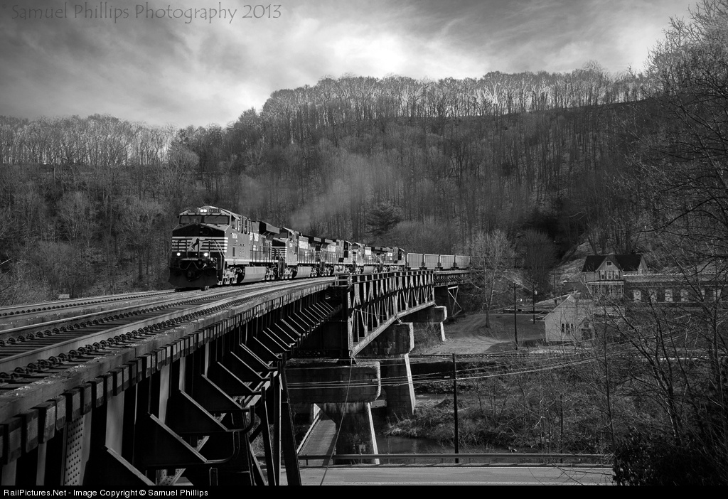 In the late afternoon, No. 751 charges westbound across the town of Coopers, W.Va., on a impressive viaduct constructed by the Norfolk & Western in 1950. The empty cars are en-route to Williamson, where they will be loaded at a near-by mine and return east with another train of black diamonds.