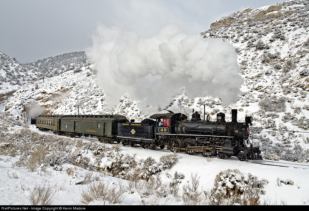 Steamscape: Lower Tunnel. Nevada Northern's elegant 10-wheeler drifts out of Lower Tunnel and on down the ore line toward the East Ely Yard in a light snow shower. The Nevada Northern is a railroad with some pretty sharp contrasts. From Ely on north, the line is flat as a pancake, running in a wide, open valley for nearly 140 miles to its northern terminus at Cobre. Go south from Ely on the 9 mile run toward Keystone and you'll travel in a tight canyon over grades that top 2%. Although this spot on the Keystone run makes for a pretty winter photograph, the truth is that the fast passenger train seen in this image would have rarely found itself out here. Rather, the "Steptoe Flyer", as she was called, would have made her living on the daily passenger runs from Ely to Cobre and back.