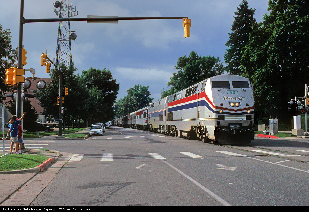 Amtrak operated a 16-car passenger train for members of AAPRCO (American Association of Private Railroad Car Owners) from Denver to Billings, Montana, for their annual convention in the summer of 1999. Here a family waves to the special as it rolls up Mason Street and crosses Olive Street at mile 73.97 on the BNSF’s Front Range Subdivision at Fort Collins, Colorado.