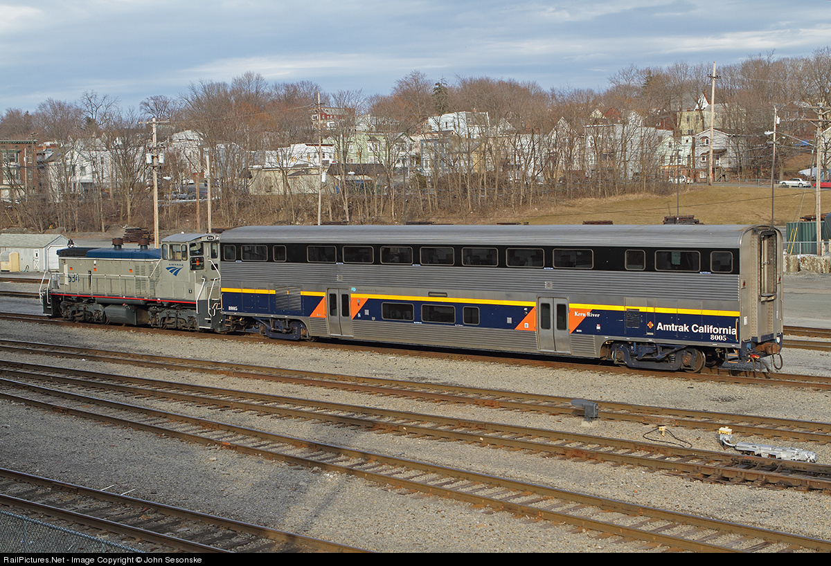 Amtrak California bilevel coach CDTX 8005, Kern River, sits in the Amtrak yard at Rensselaer after being pulled off the end of Amtrak 48 (Lake Shore Limited) on 3-9-2013. Car is suppose to be heading for interchange to CP in Albany and a trip to Hornell, NY. This car was built by Morrison Knudsen in 1996. The Amtrak MP15DC is the ex P&LE 1591, blt 5-1975.